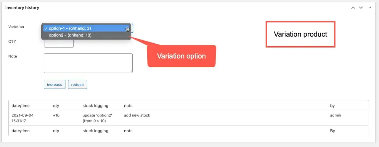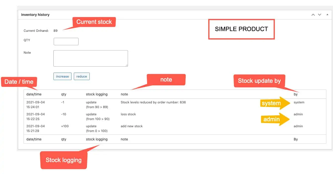 - ⚡ Able to keep a log of increasing or decreasing stock for both normal products and products with different sizes and colors (variation products), both from increasing/reducing stock by admin.