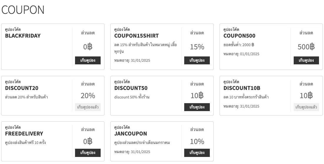 - รองรับการตั้งค่าเงื่อนไข: เช่น วันที่เริ่ม-สิ้นสุดของคูปอง, จำนวนครั้งที่ใช้ได้, และเงื่อนไขสินค้าเฉพาะ