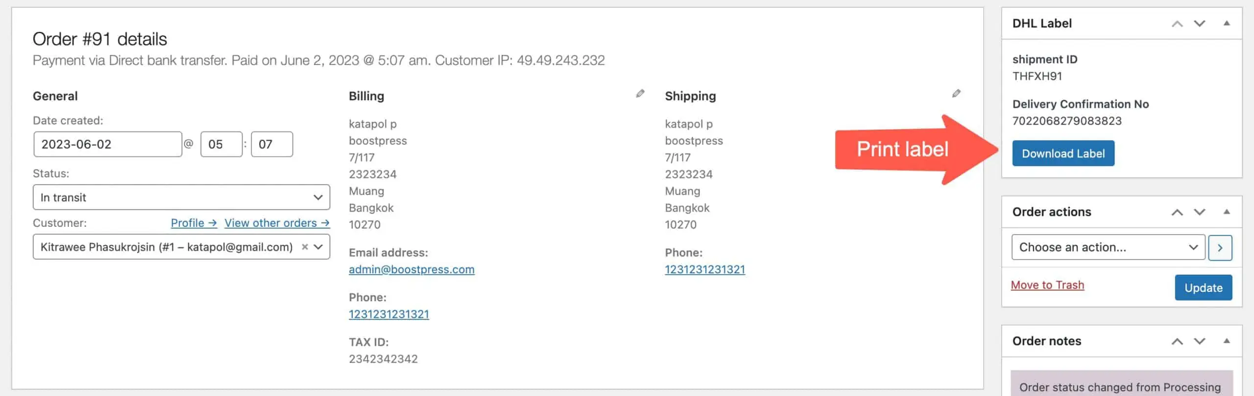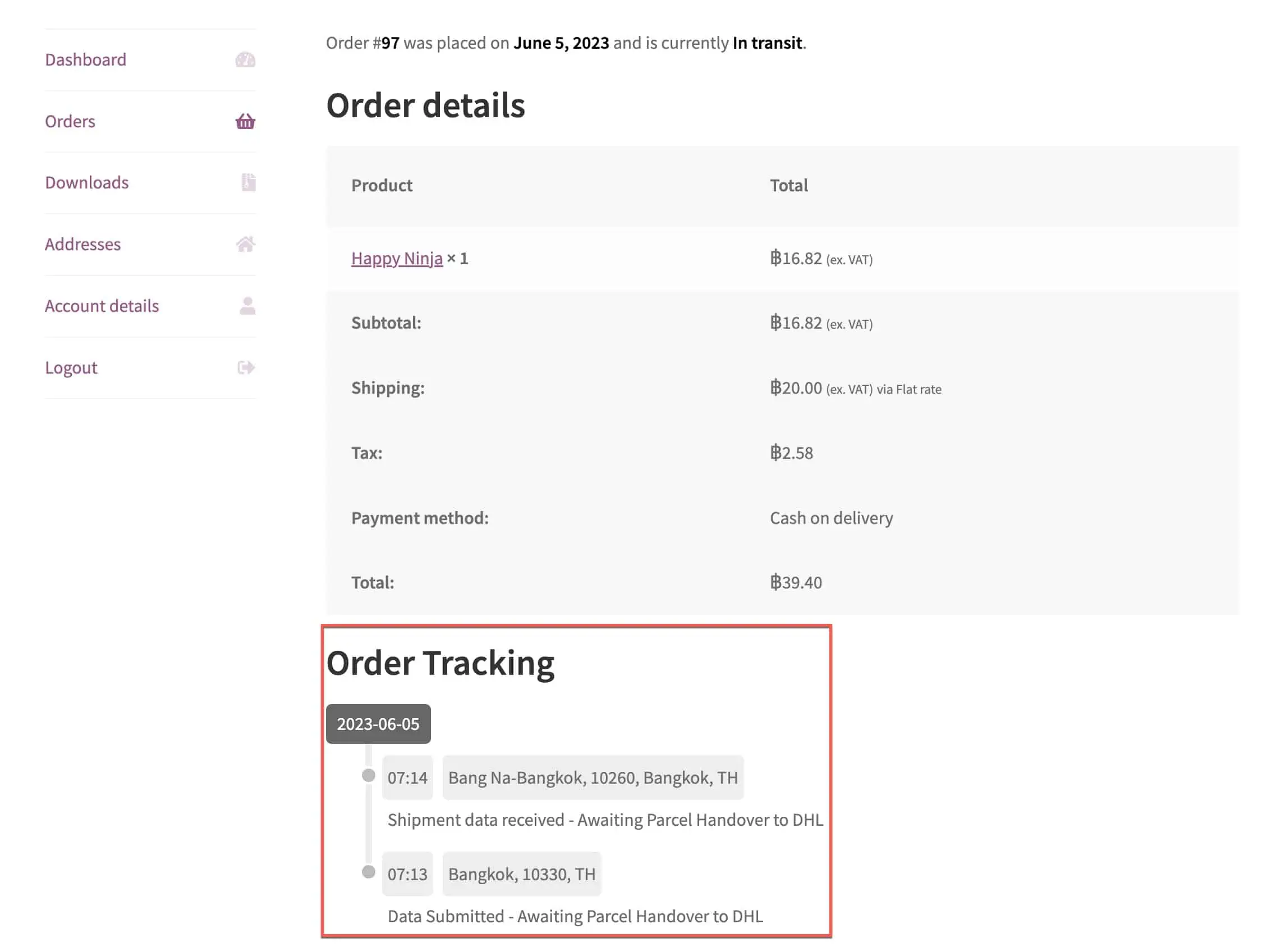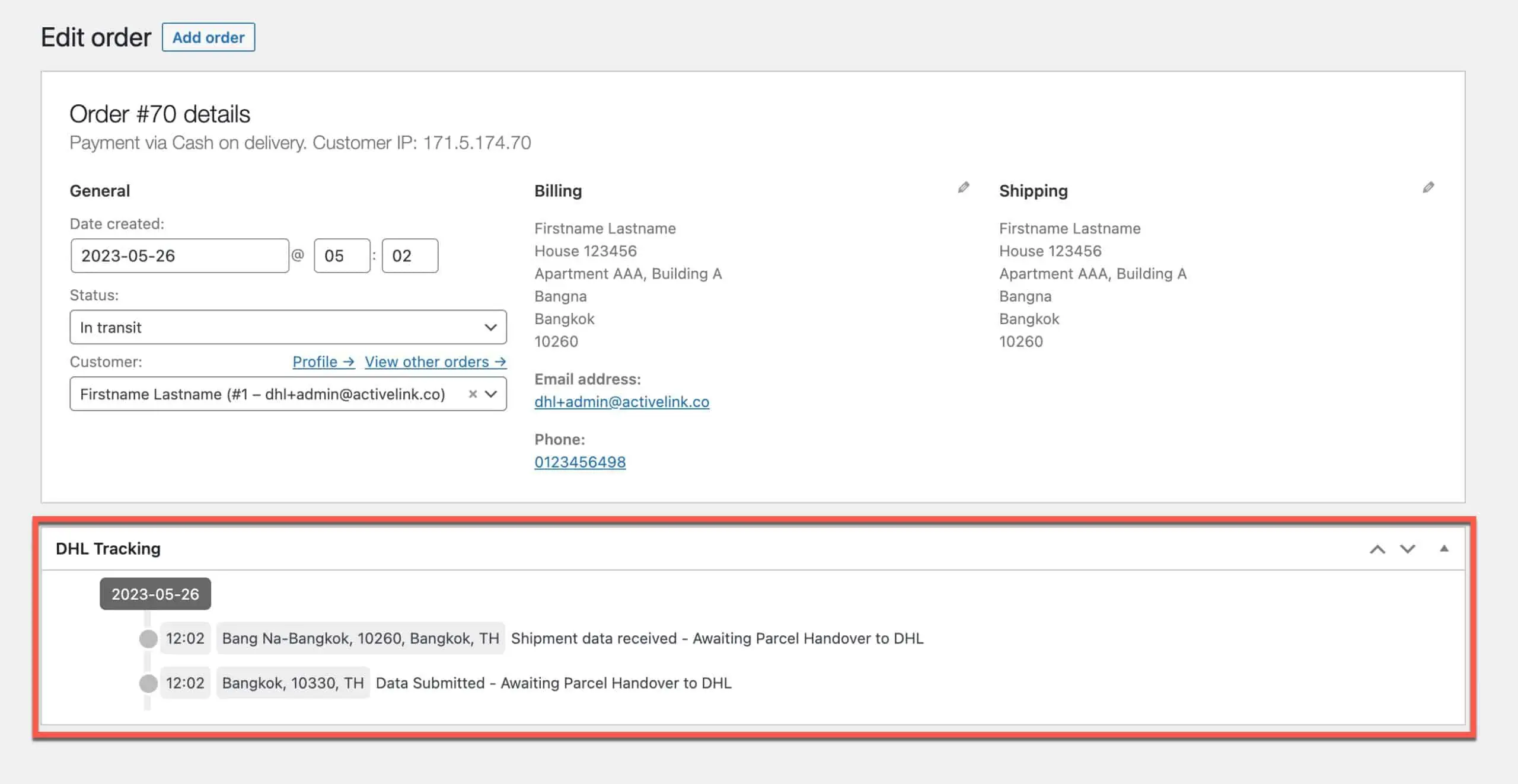 - 4. เมื่อสถานะการขนส่งของ DHL เป็นสำเร็จ Woocommerce ก็จะอัพเดทเป็น Completed โดยอัติโนมัติ