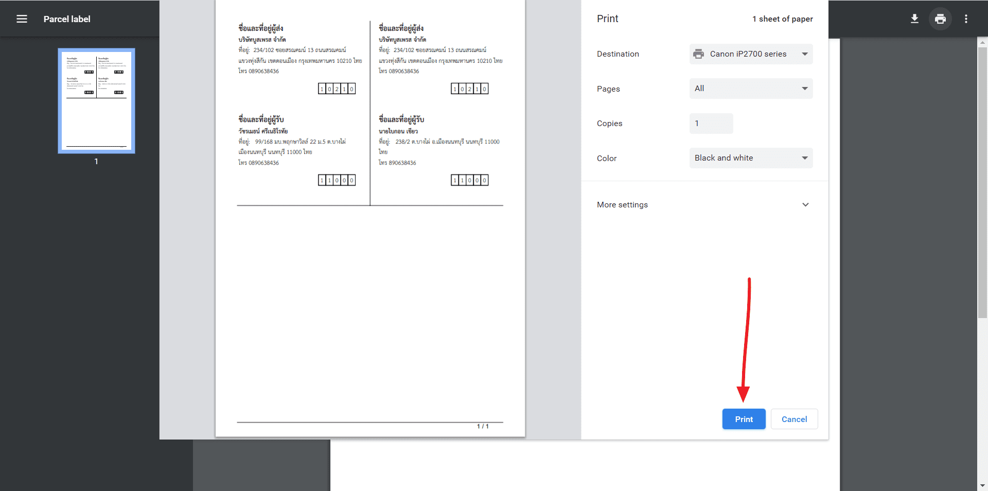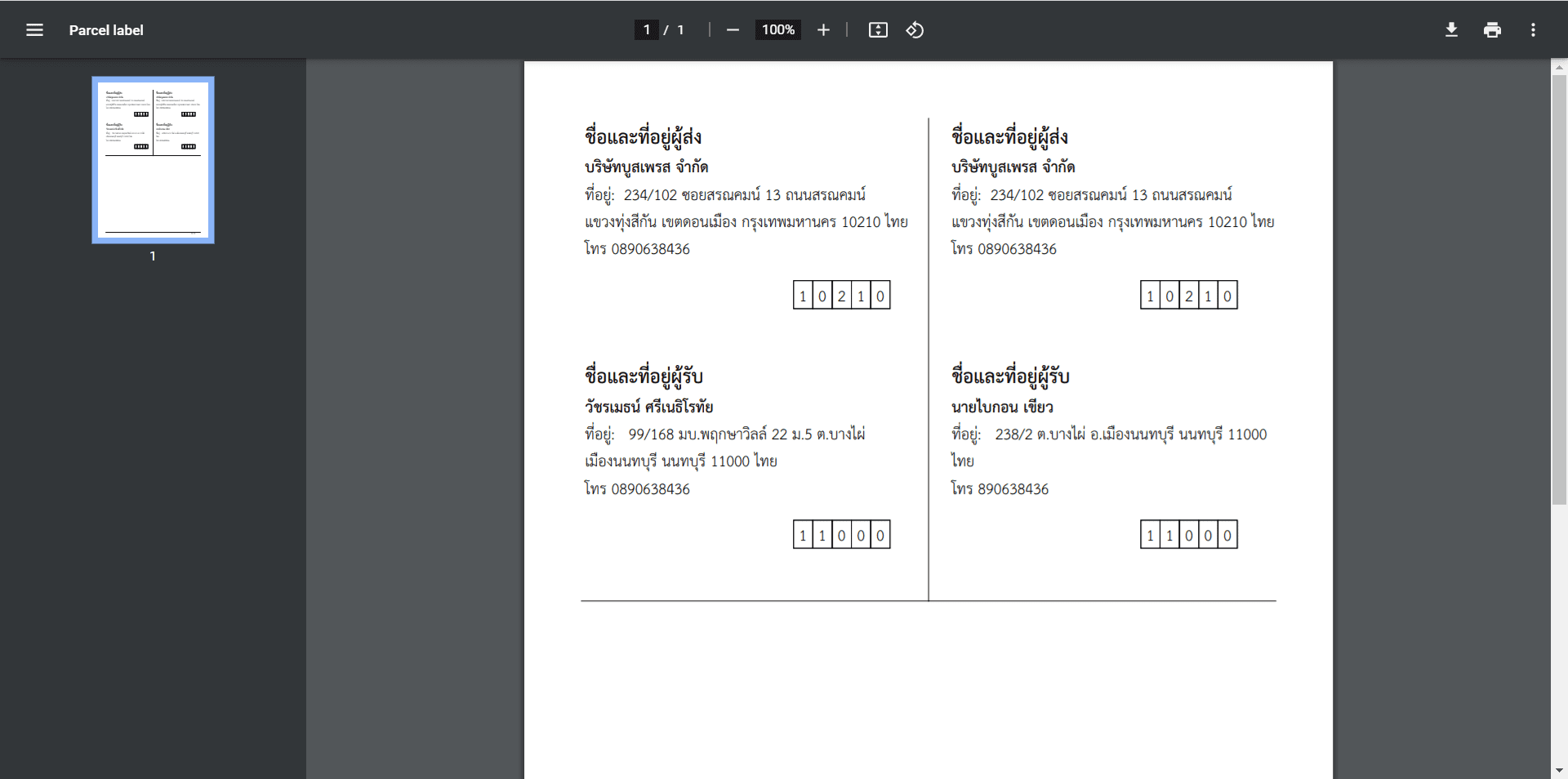 ใบแปะหน้าที่เลือกพิมพ์จะถูกพิมพ์ออกมาในขนาดของกระดาษ A4 โดยแบ่งกระดาษออกเป็น 4 ส่วน คือในหนึ่งหน้ากระดาษ A4 สามารถพิมพ์ลาเบลได้ 4 รายการ มีชื่อผู้ส่งและชื่อผู้รับแสดงอย่างเรียบร้อยสวยงาม
