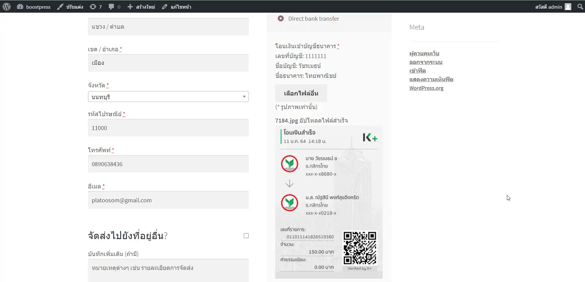 ด้วยปลักอินที่ทาง boostpress.com สร้างขึ้น ปลั๊กอิน แจ้งโอนเงิน ก่อนการสั่งซื้อ จะช่วยให้เจ้าของร้านไม่จำเป็นต้องติดตามลูกค้าอีกต่อไป ปลักอินที่เราสร้างขึ้นจะบังคับให้ลูกค้าแนบใบสลิปต์โอนเงินมาด้วยตอนสั่งซื้อสินค้า นั่นหมายความว่า เมื่อลูกค้าทำการสั่งซื้อสินค้ามาจนถึงหน้าจ่ายเงิน ลูกค้าจะต้องไปโอนเงินเป็นจำนวนตามที่แจ้งในหน้าชำระสินค้า แล้วเอาใบสลิปต์ที่ได้จากแอปธนาคารมาแนบไปกับใบสั่งซื้อ การสั่งซื้อจึงจะสำเร็จ