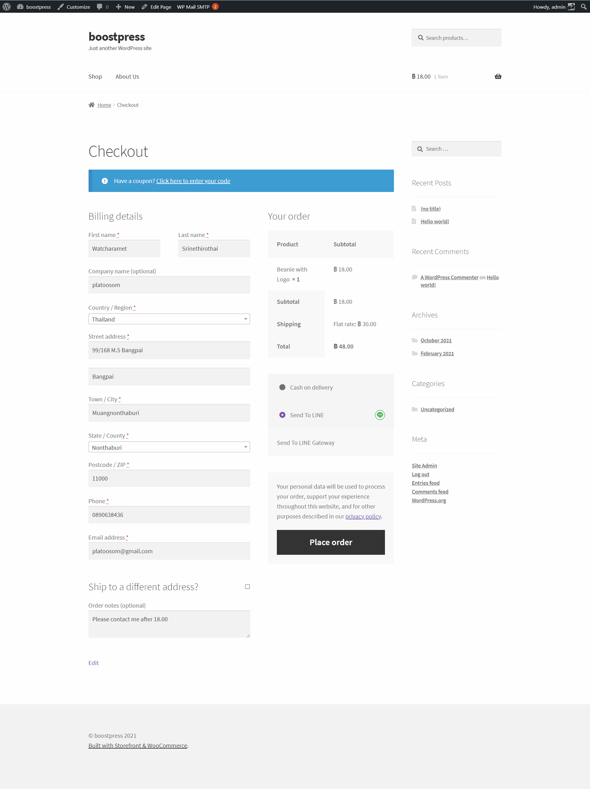 ปลั๊กอินตัวนี้เมื่อติดตั้งแล้ว จะไปแสดงเป็นตัวเลือกในการจ่ายเงิน แต่แทนที่จะเป็นการจ่ายเงินจริง ระบบจะทำการส่งใบออเดอร์การสั่งซื้อเข้าไปในไลน์ของเจ้าของร้าน