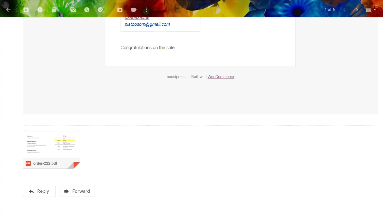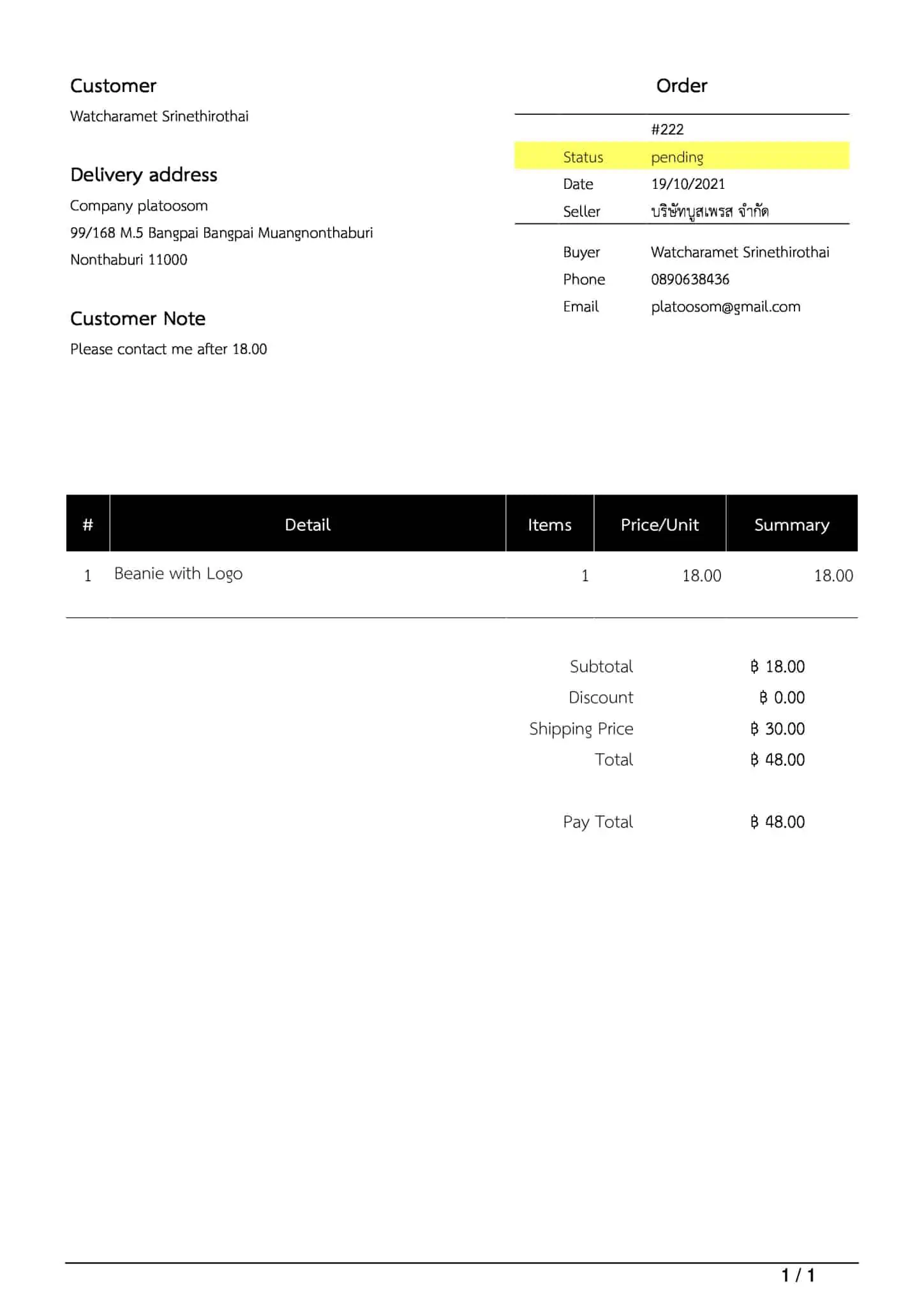 นอกจากจะส่งใบออเดอร์เข้าไปในไลน์แล้ว ระบบจะส่งไฟล์แนบออเดอร์เป็น pdf ไปให้ด้วยทั้งอีเมล์ของเจ้าของร้านและอีเมล์ของลูกค้า