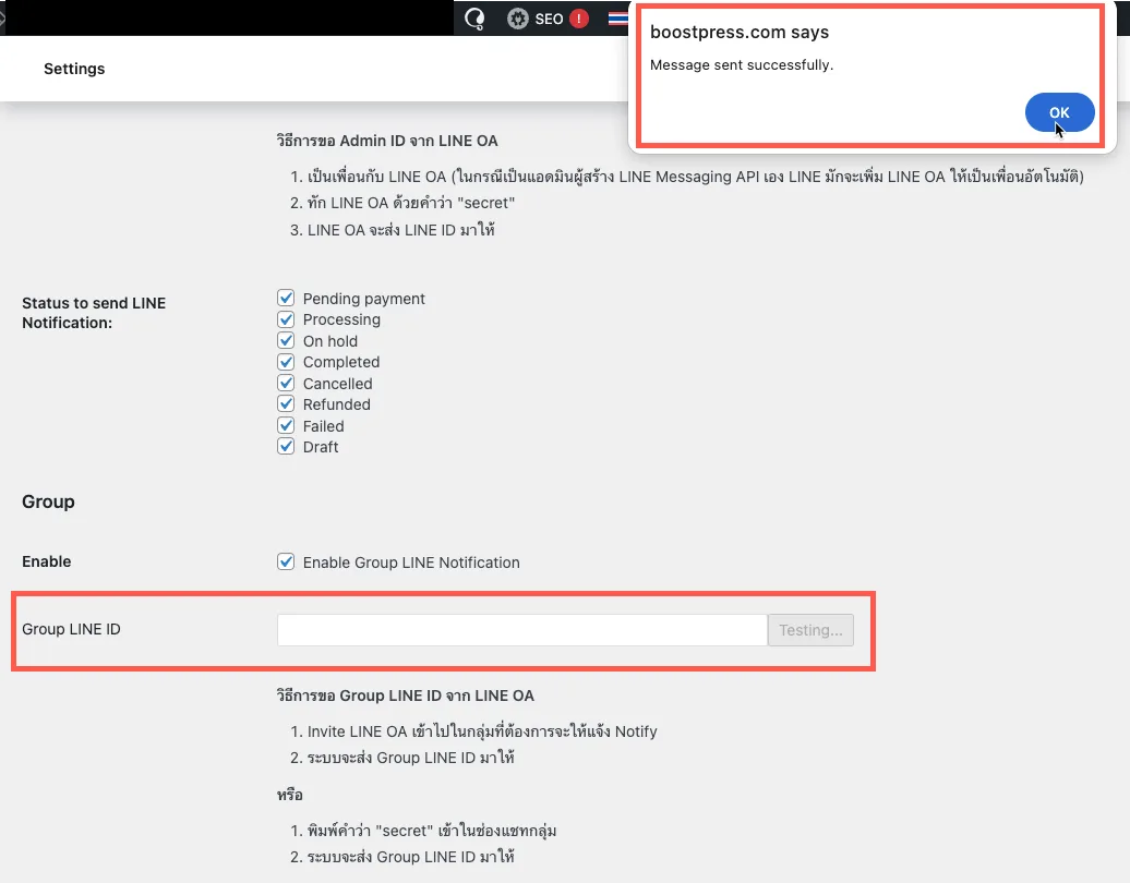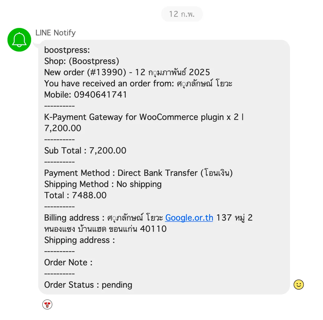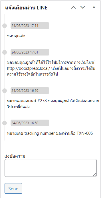 ในระบบหลังบ้านจะมีช่องให้ป้อนเมสเสจเพื่อส่งตรงหาลูกค้าได้ โดยสามารถส่ง tracking number หรือแจ้งเตือนต่างๆ เข้าสู่โปรแกรมไลน์โดยตรง